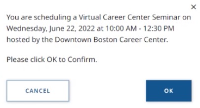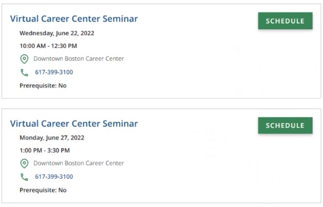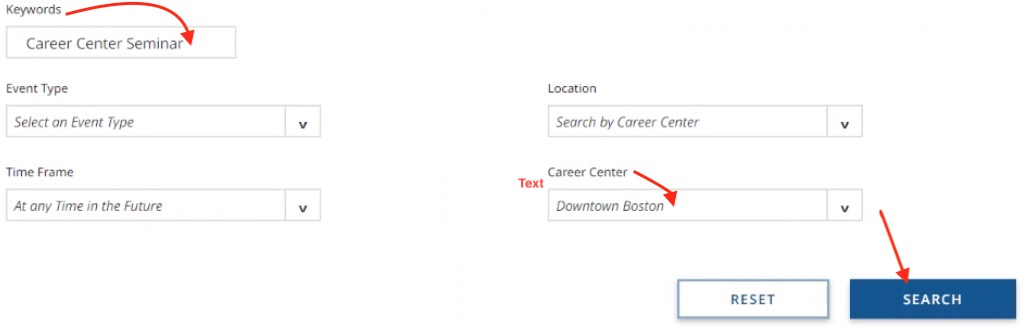 - Under Keywords type “Career Center Seminar” and under Career Center select “Downtown Boston” and click SEARCH