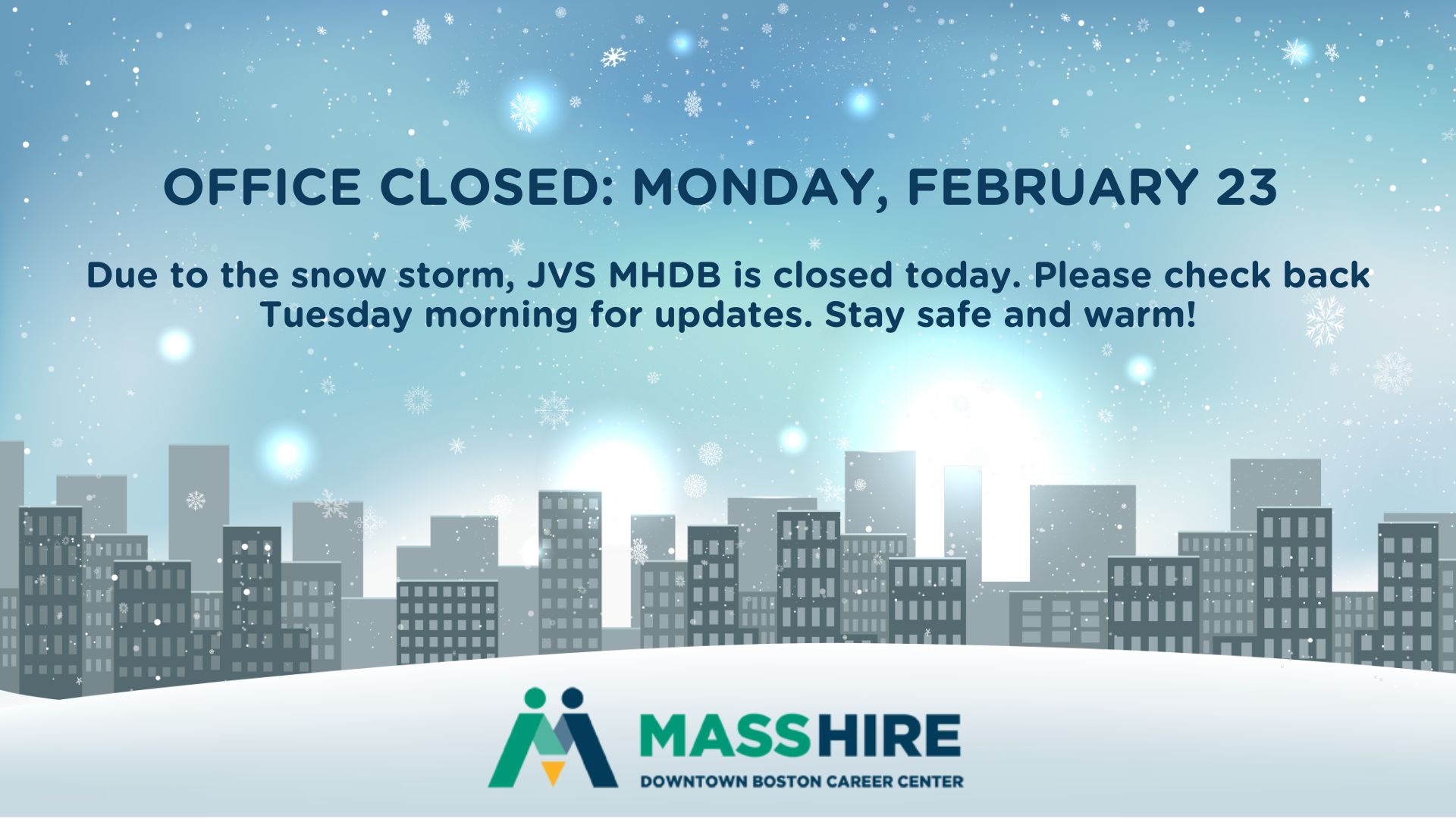 Due to the snow storm, JVS MHDB is closed today. Please check back Tuesday morning for updates. Stay safe and warm!